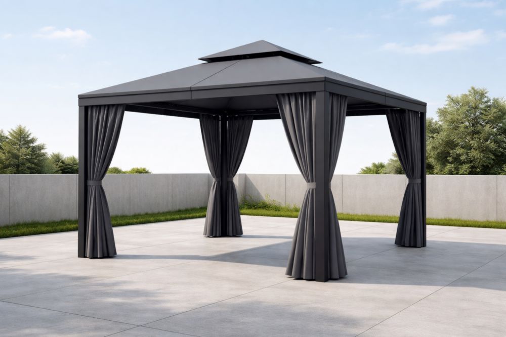 Pavillon de jardin avec toit en aluminium et cadre en acier.