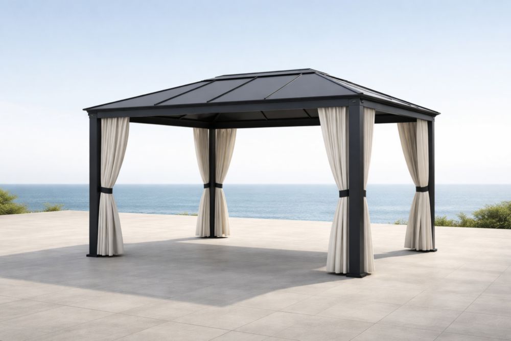 Pergola de Jardin en Aluminium avec Toit en Polycarbonate et Rideaux Beiges